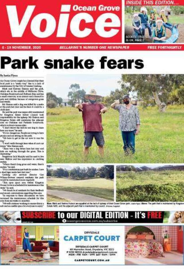 An Ocean Grove couple has claimed that their local park is a “snake trap” due to a lack of maintenance by the City of Greater Geelong.