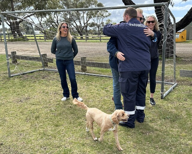 There were plenty of hugs at Barwon Heads Soccer Club this morning as Jon Phillips met with the paramedics and bystanders who saved his life.