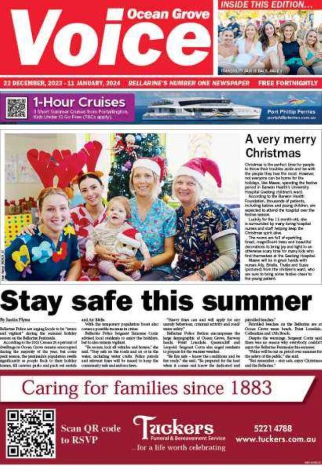 According to the 2021 Census 25.6 percent of dwellings in Ocean Grove remain unoccupied during the majority of the year, but come peak season, the peninsula’s population swells significantly as people flock to their holiday homes, fill caravan parks and pack out motels and Air B&Bs.