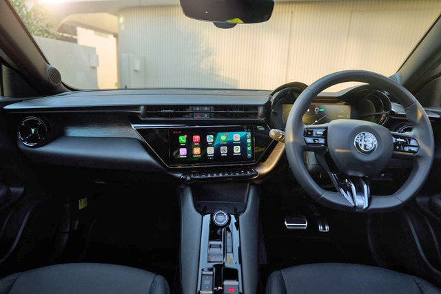 Alfa has arguably done a classy Italian job on the Junior Ibrida small SUV, but can’t disguise the swathe of cost-cutting hard plastic surfaces in the cabin surrounds. That apart, the deep Blue Navigli on test would hold its own among the best hybrids around.